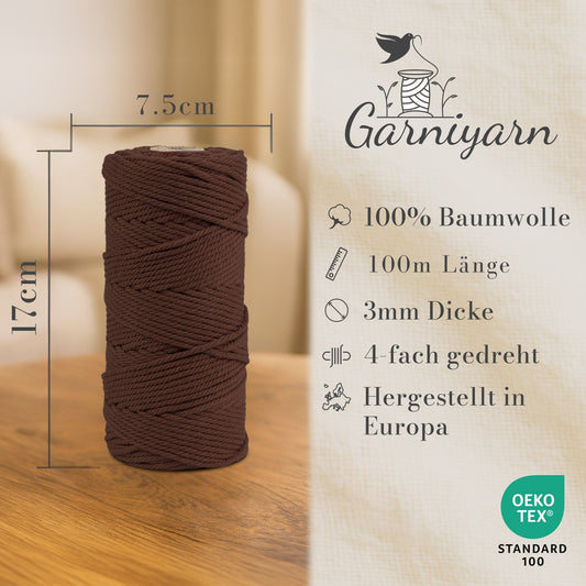 Macrame cord 3 mm Premium 100% Cotton , 100m Brown
