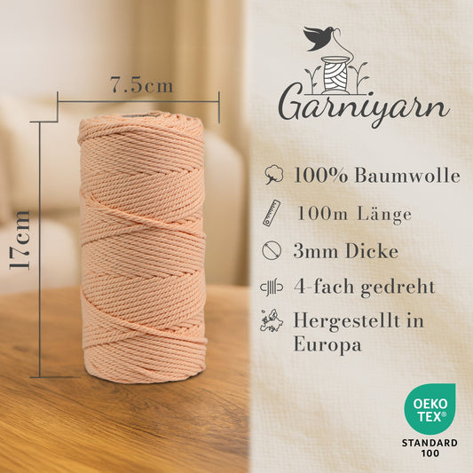 Macrame cord 3 mm Premium 100% Cotton , 100m Peach Fuzz