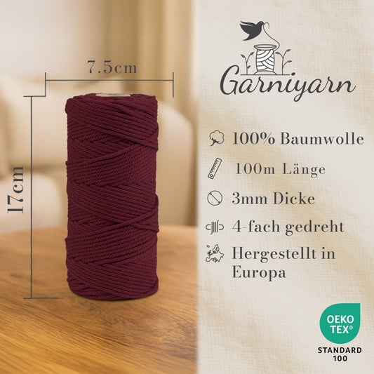 Macrame cord 3 mm Premium 100% Cotton , 100m Burgundy